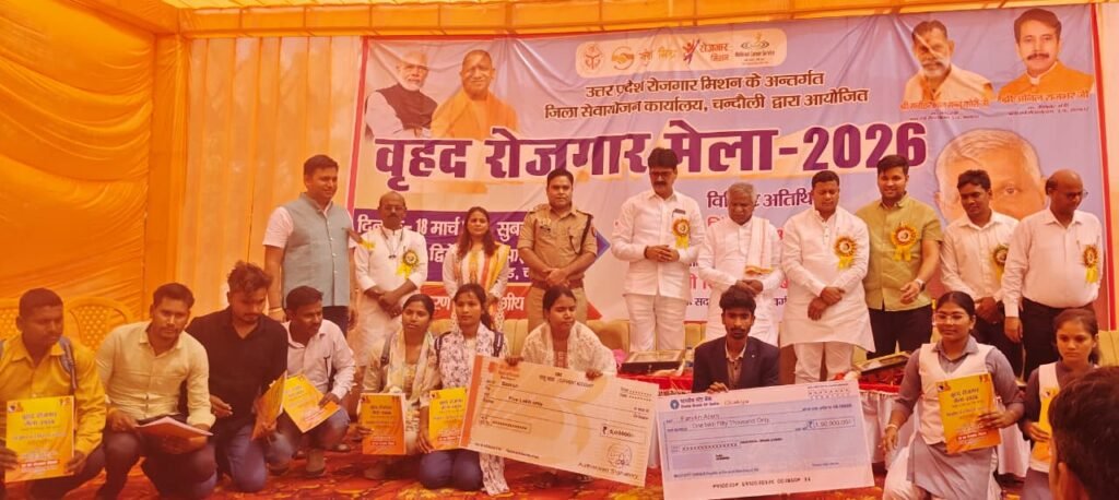 उ०प्र० रोजगार मिशन के अन्तर्गत जिला सेवायोजन कार्यालय चन्दौली द्वारा द्विवेदी प्राइवेट आई०टी०आई० परिसर, अहरौरा रोड चकिया चन्दौली में दिनांक 18 मार्च, 2026 को वृहद रोजगार मेला का आयोजन किया गया। इस रोजगार मेला में कुल 30 कम्पनियों द्वारा प्रतिभाग किया गया। जिसमें हिण्डाल्को द्वारा 21, अशोक लीलैंड द्वारा 19, मिण्डा द्वारा 10, टाटा मोटर्स द्वारा 111, आई०सी०आई०सी०आई० बैंक द्वारा 14, एल०आई०सी० द्वारा 10, सुब्रोश द्वारा 09, एस०आई०एस० सिक्योरटी द्वारा 33 सहित कुल 648 अभ्यर्थियों को विभिन्न कम्पनियों द्वारा जॉब आफर दिया गया। मेले में लगभग 1500 अभ्यर्थियों द्वारा प्रतिभाग किया गया।