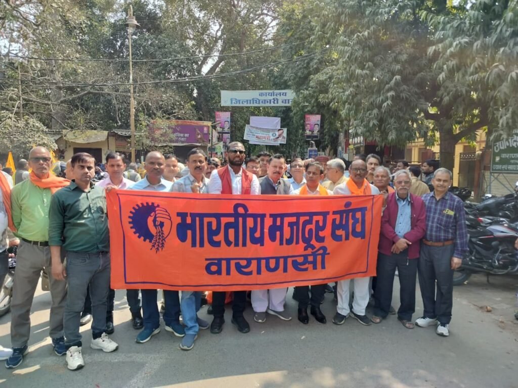 भारतीय मजदूर संघ वाराणसी द्वारा सरकार के खिलाफ किया गया देश व्यापी विरोध प्रदर्शन जिलाधिकारी को सौंपा ज्ञापन
