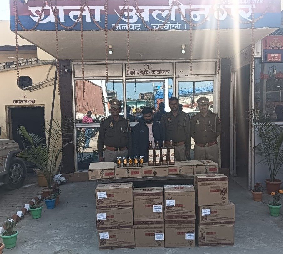 चन्दौली- पुलिस अधीक्षक चन्दौली आदित्य लांग्हे द्वारा शराब तस्करी पर प्रभावी अंकुश लगाये जाने व तस्करी में संलिप्त अभियुक्तों की गिरफ्तारी हेतु दिये गये निर्देशों के अनुपालन के क्रम में अपर पुलिस अधीक्षक सदर, अनंत चन्द्रशेखर (आई.पी.एस.) व क्षेत्राधिकारी पीडीडीयू नगर अरुण कुमार सिंह के कुशल पर्यवेक्षण में प्रभारी निरीक्षक अलीनगर अनिल कुमार पाण्डेय के कुशल नेतृत्व में दिनांक-09.02.2026 को थाना अलीनगर पुलिस टीम द्वारा पचफेडवा बाजार में संदिग्ध व्यक्ति/वाहनों की चेकिंग की जा रही थी कि मुखबिर द्वारा सूचना प्राप्त हुई कि वाराणसी की तरफ से रिंग रोड से होते हुये एक व्यक्ति ट्रक से अवैध शराब लेकर चन्दौली होते हुये बिहार जाने वाला है। उक्त सूचना के आधार पर स्थानीय पुलिस टीम द्वारा तत्काल पचफेडवा स्थित रिंग रोड के ओवर ब्रिज के पास पहुंच कर वाहनों की चेकिंग की जा रही थी कि कुछ देर पश्चात 01 ट्रक वाहन संख्या UP50CT1544 के नजदीक आने पर पुलिस टीम द्वारा टार्च की रोशनी से रुकने का इशारा किया गया तो ट्रक चालक ट्रक को तेजी से लेकर भागना चाहा जिसे वहां मौजूद पुलिस टीम द्वारा सिखलाये गये तरीके से कुछ दूरी पर ही रुकवा लिया गया। ट्रक वाहन को रुकवा कर चालक को पकड़ लिया गया। वाहन चालक से ट्रक के ड्राईवर केविन के रैक को खुलवाकर चेक किया गया तो उसमे से 10 पेटी रॉयल स्टैग 120 बॉटल शराब प्रत्येक 750 ML, 10 पेटी रॉयल स्टैग 240 बॉटल शराब प्रत्येक 375 ML व 31 पेटी 8 PM 1488 टेट्रा पैक शराब प्रत्येक 180 ML कुल मात्रा 448 लीटर शराब बरामद हुई। गिरफ्तार अभियुक्त की पहचान 1.जुगनू यादव पुत्र राधेश्याम यादव निवासी सोनवरसा थाना चौबेपुर जनपद वाराणसी उम्र करीब 27 वर्ष के रुप में हुई। गिरफ्तारी व बरामदगी के आधार पर थाना स्थानीय द्वारा मु0अ0स0-83/2026 धारा-60/63 आबकारी अधिनियम में अभियोग पंजीकृत कर आवश्यक वैधानिक कार्यवाही प्रचलित है ।