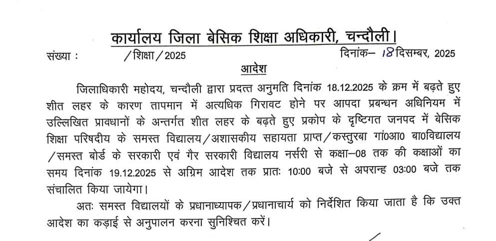 जिलाधिकारी चन्द्र मोहन गर्ग के निर्देशानुसार जिला बेसिक शिक्षा अधिकारी सचिन कुमार ने बताया कि बढ़ते हुए शीत लहर के कारण तापमान में अत्यधिक गिरावट होने पर आपदा प्रबन्धन अधिनियम में उल्लिखित प्रावधानों के अन्तर्गत शीत लहर के बढ़ते हुए प्रकोप के दृष्टिगत जनपद में बेसिक शिक्षा परिषदीय के समस्त विद्यालय/अशासकीय सहायता प्राप्त / कस्तुरबा गां०आ० बा०विद्यालय / समस्त बोर्ड के सरकारी एवं गैर सरकारी विद्यालय नर्सरी से कक्षा-08 तक की कक्षाओं का समय दिनांक 19.12.2026 से अग्रिम आदेश तक प्रातः 10:00 बजे से अपरान्ह 03:00 बजे तक संचालित किया जायेगा।