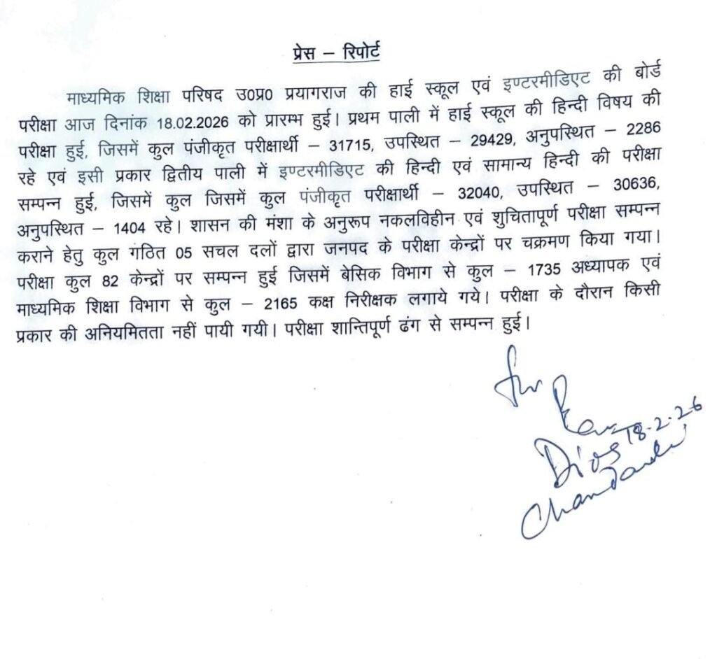 प्रथम पाली में हाई स्कूल की हिन्दी विषय की परीक्षा हुई, जिसमें कुल पंजीकृत परीक्षार्थी 31715, उपस्थित 29429, अनुपस्थित 2286 रहे एवं इसी प्रकार द्वितीय पाली में इण्टरमीडिएट की हिन्दी एवं सामान्य हिन्दी की परीक्षा सम्पन्न हुई, जिसमें कुल जिसमें कुल पंजीकृत परीक्षार्थी 32040, उपस्थित 30636, अनुपस्थित 1404 रहे। शासन की मंशा के अनुरूप नकलविहीन एवं शुचितापूर्ण परीक्षा सम्पन्न कराने हेतु कुल गठित 05 सचल दलों द्वारा जनपद के परीक्षा केन्द्रों पर चक्रमण किया गया। 1735 अध्यापक एवं परीक्षा कुल 82 केन्द्रों पर सम्पन्न हुई जिसमें बेसिक विभाग से कुल माध्यमिक शिक्षा विभाग से कुल 2165 कक्ष निरीक्षक लगाये गये। परीक्षा के दौरान किसी प्रकार की अनियमितता नहीं पायी गयी। परीक्षा शान्तिपूर्ण ढंग से सम्पन्न हुई।