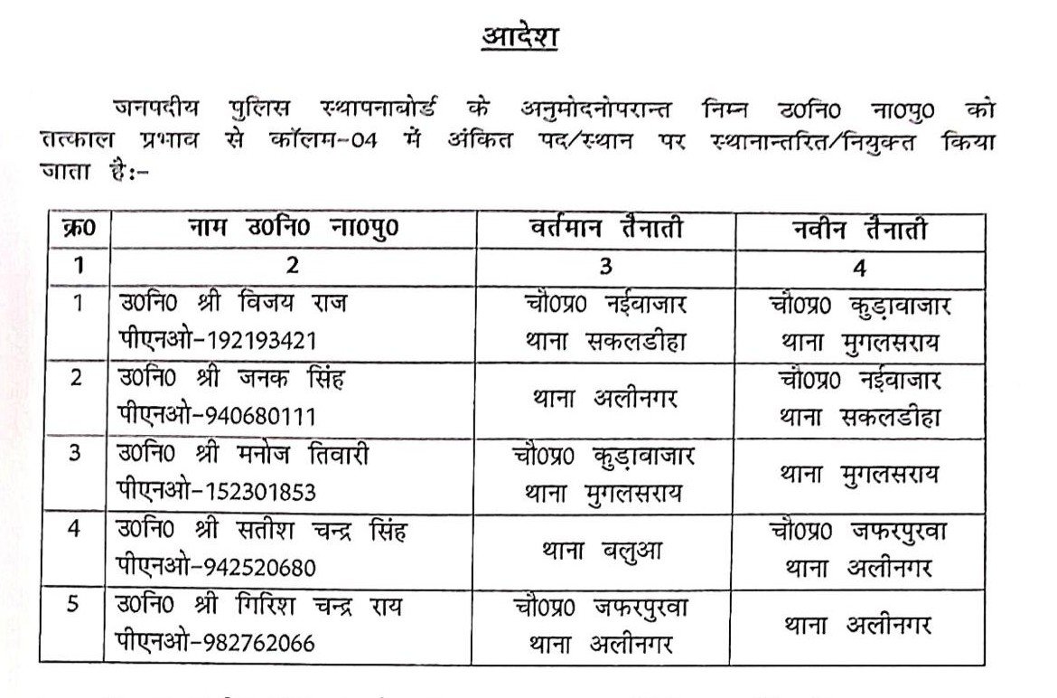 चंदौली- जिले में कानून-व्यवस्था को और अधिक सुदृढ़ बनाने के उद्देश्य से पुलिस अधीक्षक आदित्य लांघे द्वारा लगातार प्रशासनिक सख्ती बरती जा रही है। इसी क्रम में शुक्रवार को पांच उपनिरीक्षकों के तबादले किए गए हैं। इस तबादले की सूची में तीन पुलिस चौकियों के प्रभारी भी शामिल हैं। जिनका कार्यक्षेत्र बदला गया है। एसपी द्वारा किए गए इन बदलावों को जिले में पुलिस व्यवस्था को अधिक प्रभावी और सक्रिय बनाने की दिशा में एक अहम कदम माना जा रहा है।