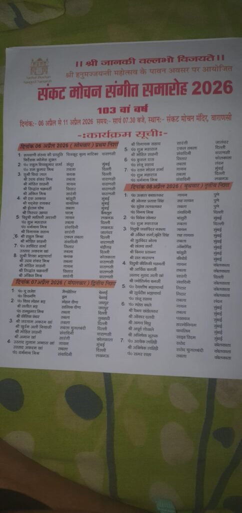 Sankat Mochan Hanuman Temple में हर वर्ष की तरह इस बार भी संकट मोचन संगीत समारोह 2026 का भव्य आयोजन किया जा रहा है। यह समारोह इस वर्ष अपना 103वां वर्ष मना रहा है।