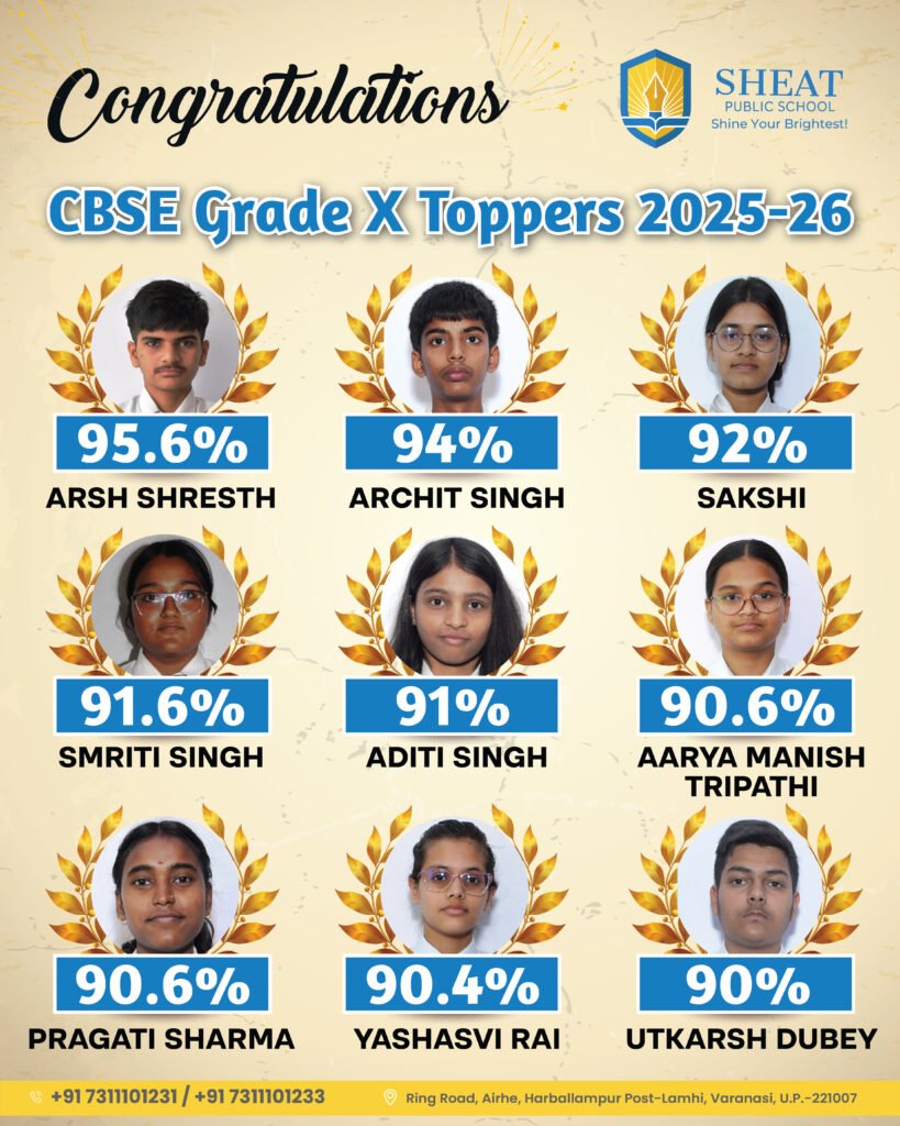 वाराणसी के हरहुआ क्षेत्र स्थित SHEAT Public School के विद्यार्थियों ने CBSE 10वीं बोर्ड परीक्षा 2025-26 में उत्कृष्ट प्रदर्शन करते हुए विद्यालय का नाम रोशन किया है। परिणाम घोषित होते ही विद्यालय में खुशी का माहौल छा गया और छात्र-छात्राओं के साथ-साथ अभिभावकों में भी उत्साह देखने को मिला।